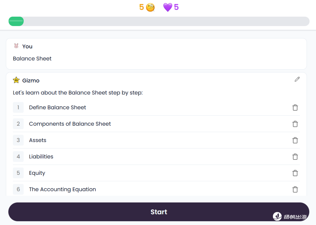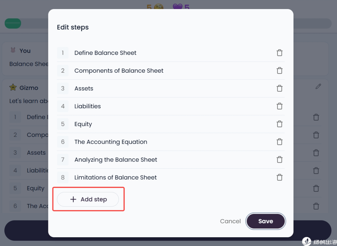 在每个知识点的学习中,Gizmo会将抽象概念拆解成若干步骤,用户既能自由删除不需要的部分,也能自定义添加新步骤。