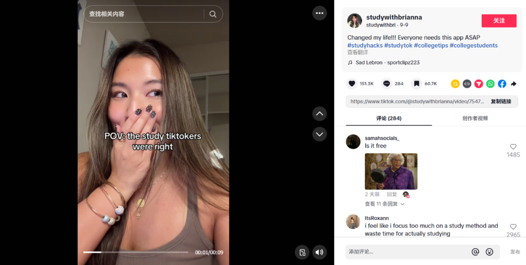 今年9月9日,一位账号ID为@studywithbrianna的大学生学习博主发布了一条仅9秒的视频,展示了自己使用Gizmo进行学习的场景。截至截稿,该视频已获得15万点赞和6万收藏,而她的账号粉丝仅有1030人。