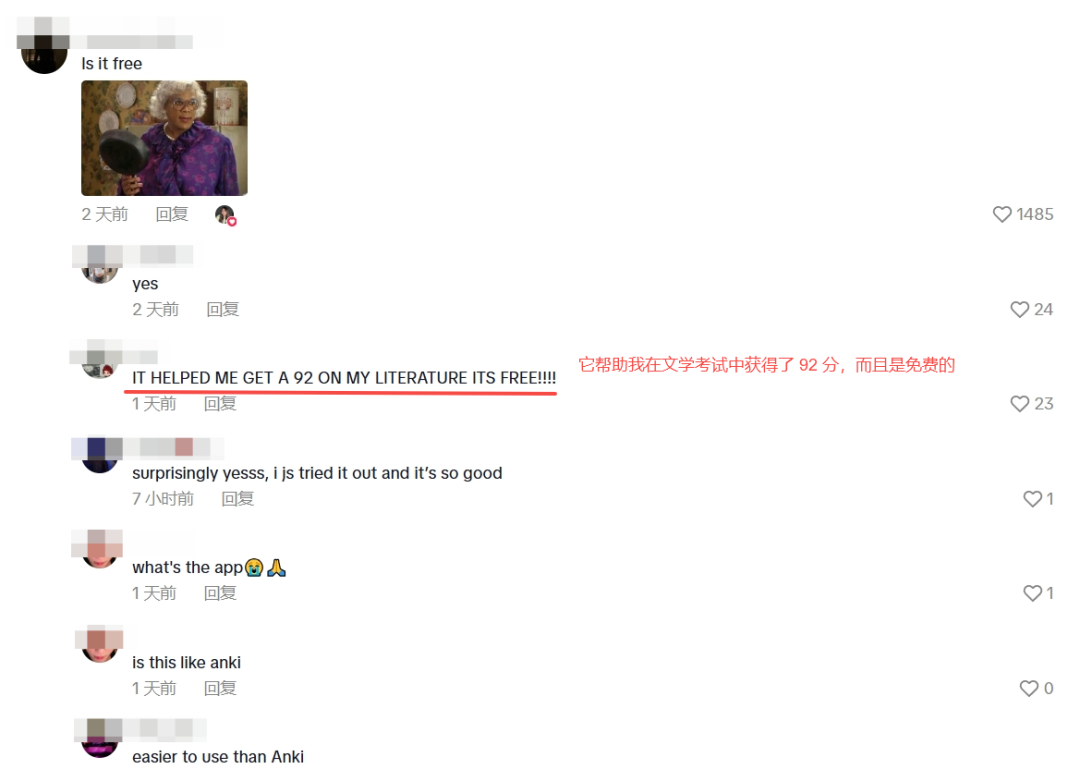 在评论区中,许多海外大学生纷纷询问“这是什么应用?”“它是免费的吗?”而已经体验过的用户大多给出了积极反馈。例如,有一位用户评论道:“它(Gizmo)帮助我在文学考试中拿到了92分。”由此可见,产品的学习模式确实给用户带来了实质性的成绩提升。