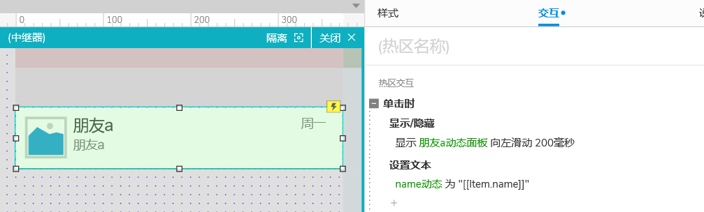 - 对话页名称对应替换:设置动态面板中的标题文本=中继器聊天界面当前行的名称