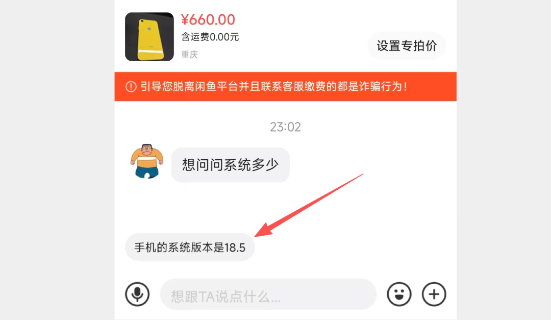 先还原一下真实场景,晚上10点多,一个买家问我这个手机的系统版本是多少。当我打开对话框想要回复的时候,发现对话框上方有一个快捷的选项,如下图所示,直接就可以点击恢复,提供的答案也是正确的。