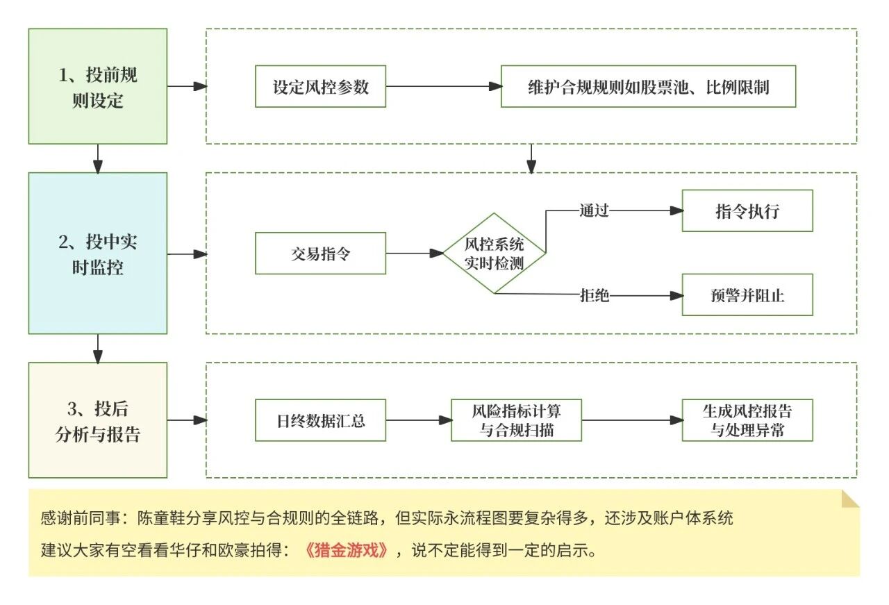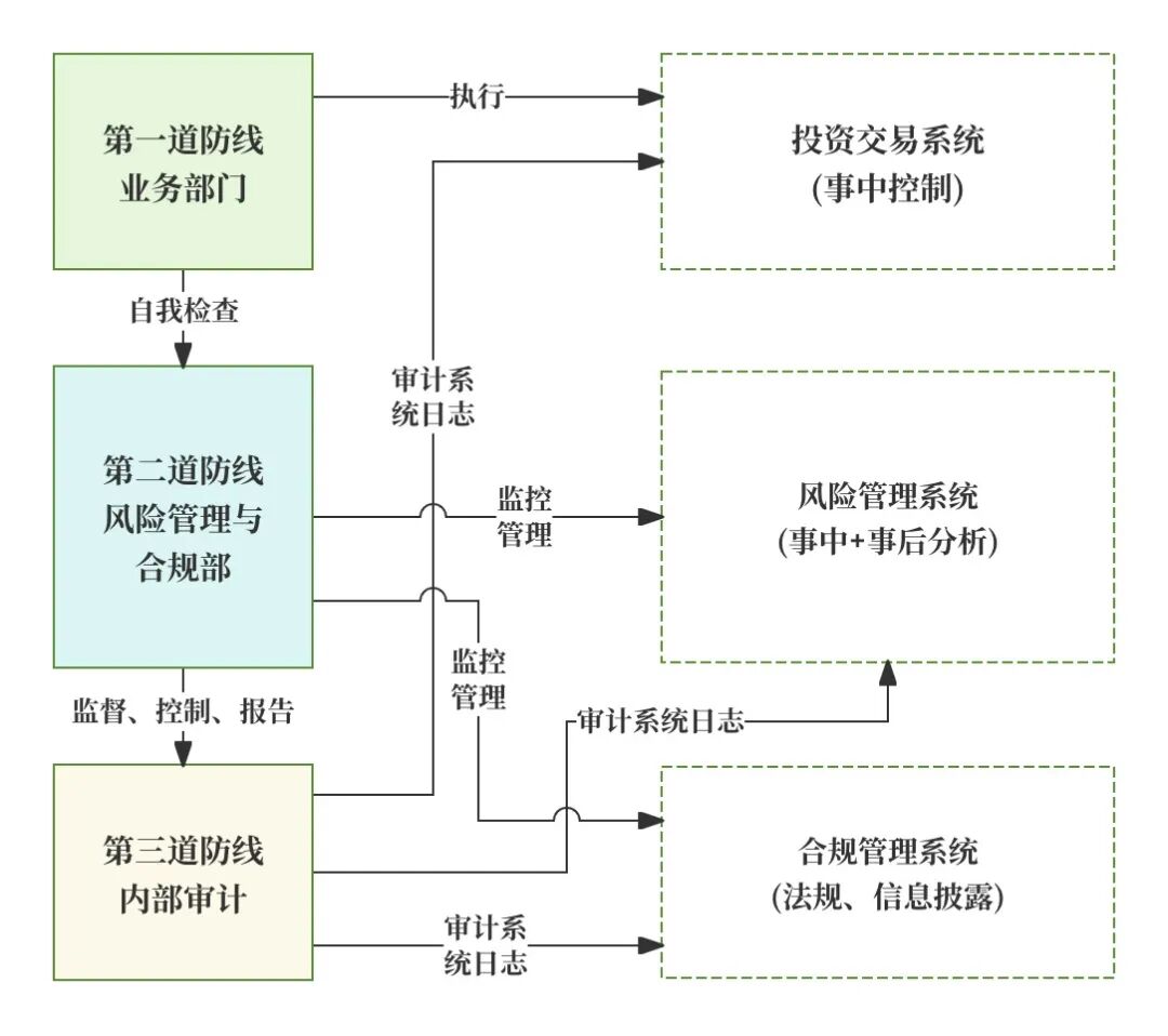 前面5大模块,已梳理过投研、交易、运营、营销等环节,我们来聊聊:风控与合规的事项,它可从事前、事中、事后对基金可能出现风险点进行监控与干预,设置三道防线,从而有效阻断风险的发生。在这个过程中又分风险管理和合规管理。