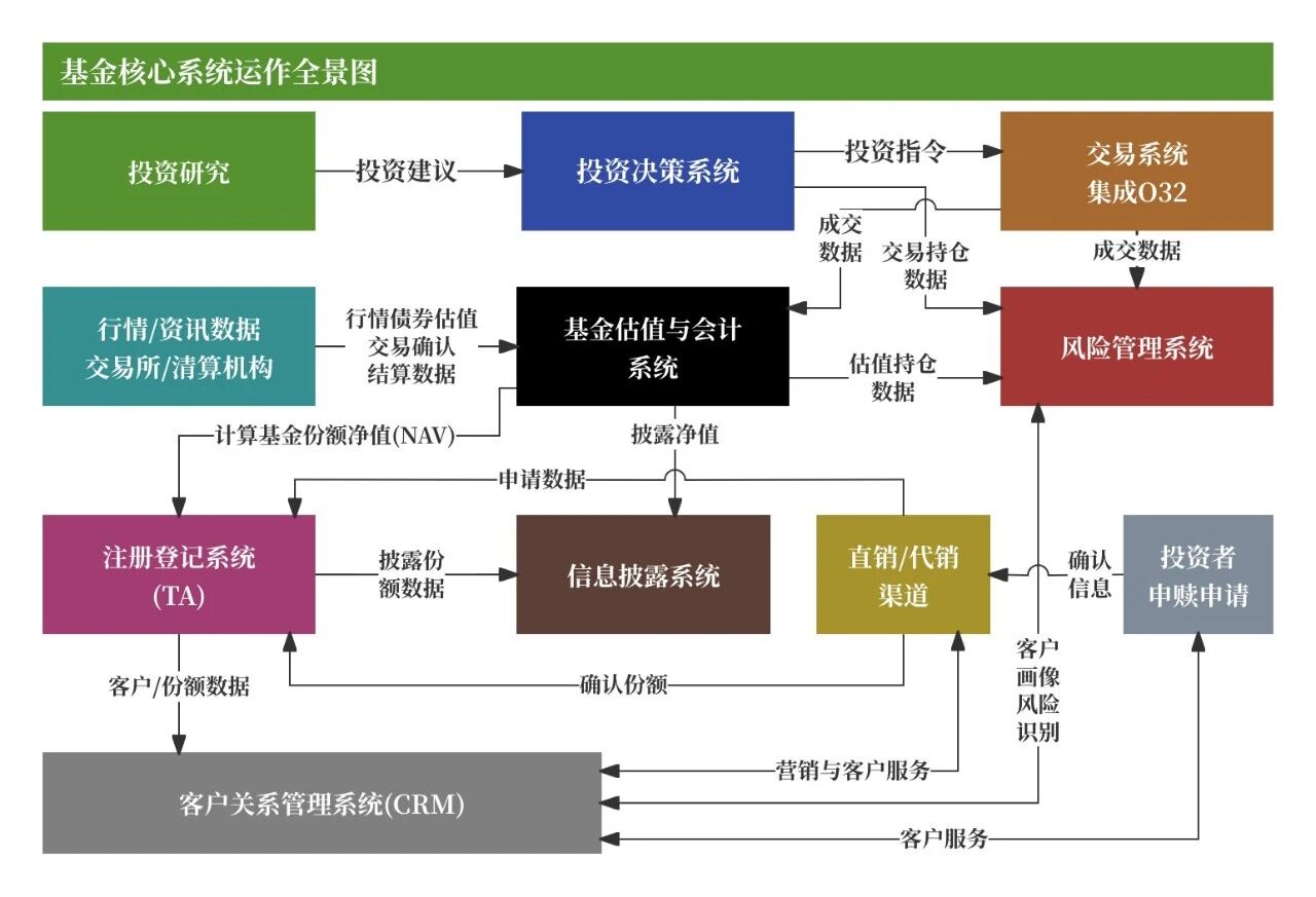 烦请大家先看张:基金核心系统运作全景图,从图中可清晰得知各个系统之间脉络、各子系统的作用,公募基金从投资决策到净值公布,再到投资者申购赎回的完整闭环流程,以及各核心系统在其中扮演的角色。