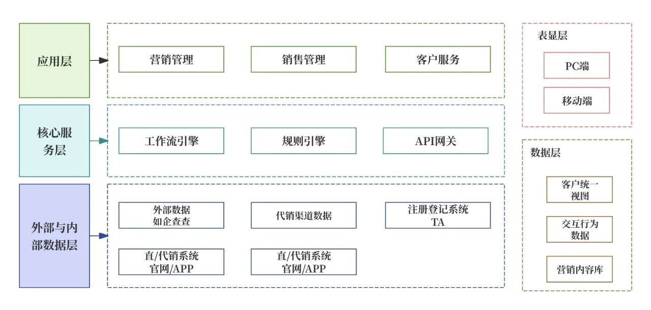 架构:客户关系管理系统/CRM采用多层架构,“表显层-应用层-数据层-外部接口”的分层架构,确保高准确性和及时性,如下图所示。