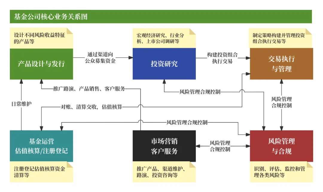 下面以公募基金为例介绍其核心业务,它构成了基金公司其营收和运营的基础,主要有6大类:产品设计与发行、投资研究、交易执行与管理、基金运营、市场营销与客户服务、风险管理与合规,概括起来就是:“募、投、管、退”。烦请大家先看6大业务关系图建立整体认知,再阅读6大类业务的简介。