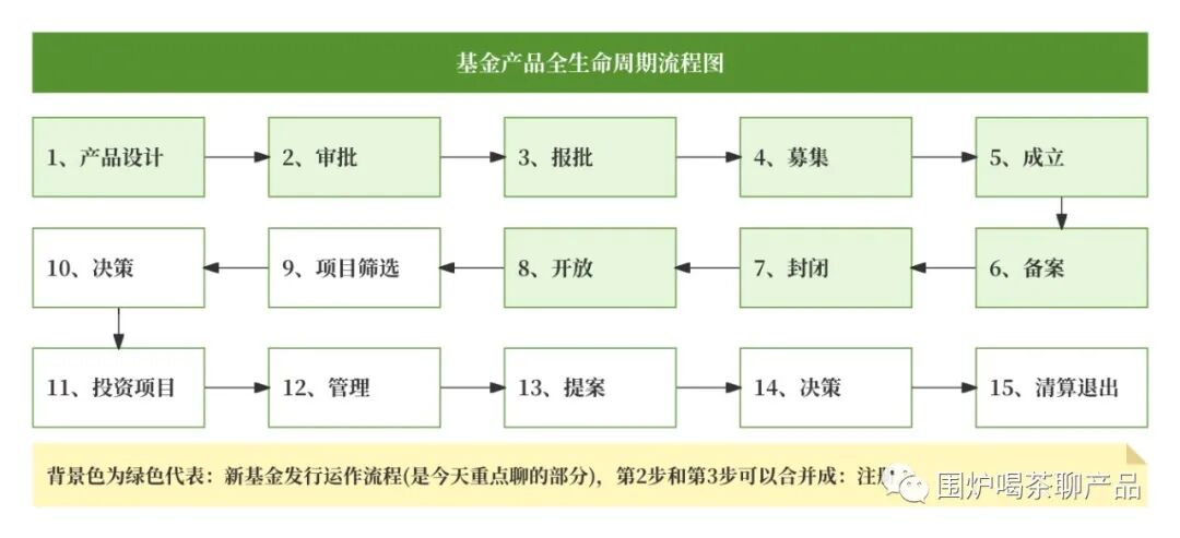 附上基金产品全生命调流程图,绿色块代表基金产品设计与发行的流程:
