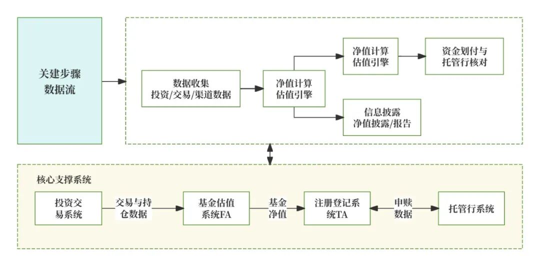 关键步骤:数据接收与预处理 -> 日终批量作业(净值计算、份额登记、资金清算) -> 生成各类估值表、会计报告 -> 将基金净值披露给证监会指定信息披露平台 -> 系统进行日终备份;