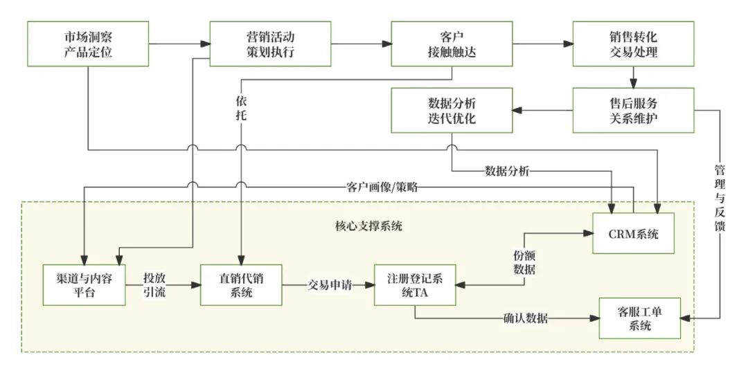 关键步骤:市场洞察/产品定位 -> 营销活动策划执行 -> 客户触达/销售转化 -> 交易处理、确认 -> 客户服务、关系维护 -> 数据分析与迭代优化;