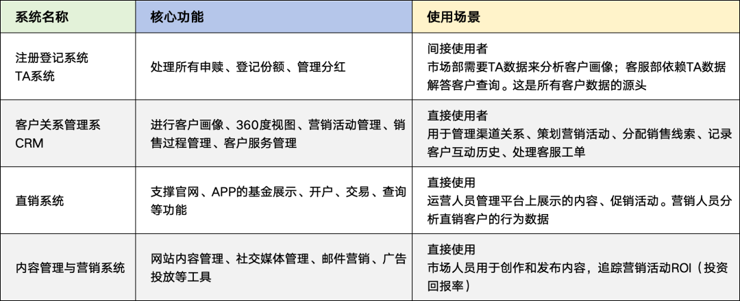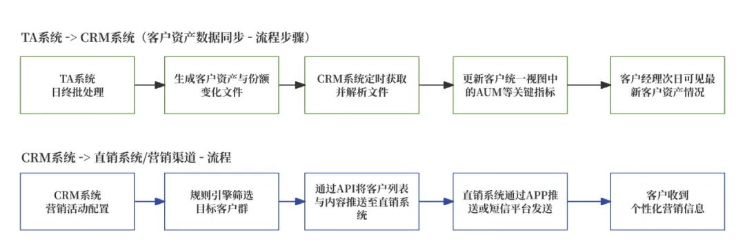 对接系统:CRM系统、代销渠道/基金公司直销系统、TA系统、客服系统/工单系统、数据分析报表。