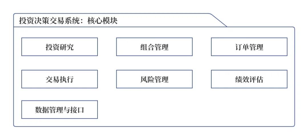 概念:基金公司的核心业务平台,用于投资组合管理、投资决策、交易执行、风险控制和绩效分析的一体化IT平台,连接了投资研究、交易执行、风险管理和后台运营等多个环节,是基金经理、投资经理和交易员日常工作的核心工具。实现研究-决策-执行-评估的闭环管理。