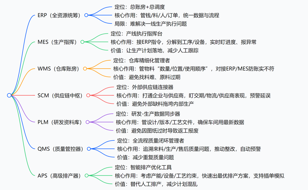 ERP是全资源管理,MES是执行落地,WMS盯仓库,APS优化排产,SCM管上下游,PLM管研发设计,QMS盯质量。