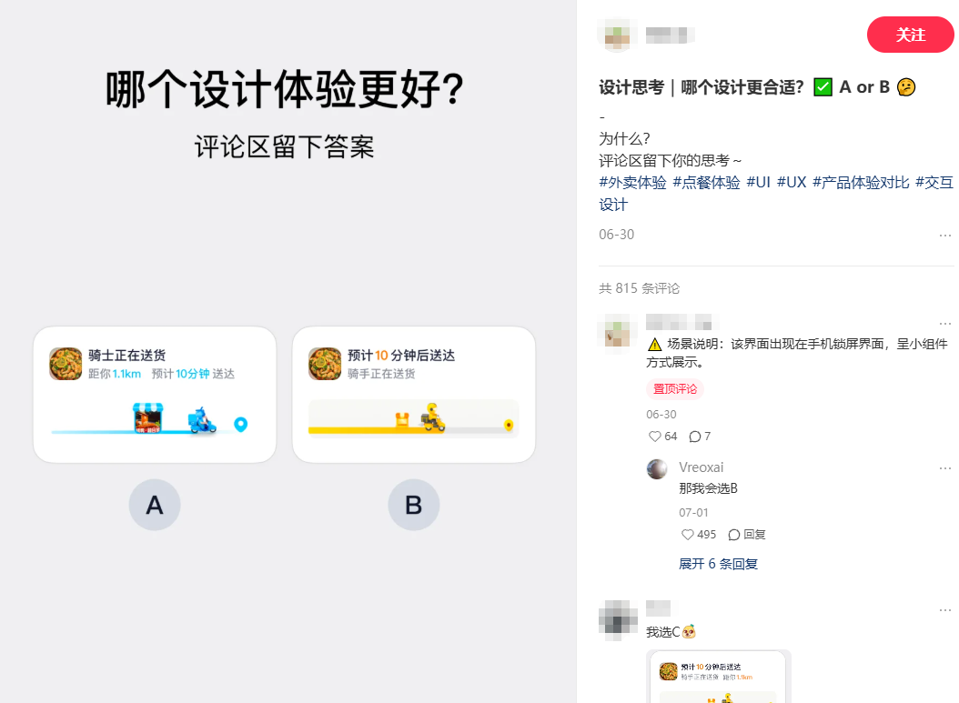 帖子内容超级简单,主图里放置AB两张图,代表AB两种设计方案,然后询问“哪个设计体验更好”,让大家在评论区留下方案。