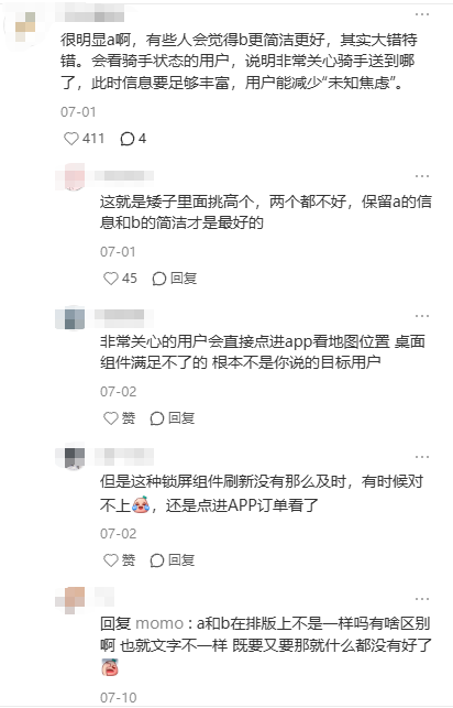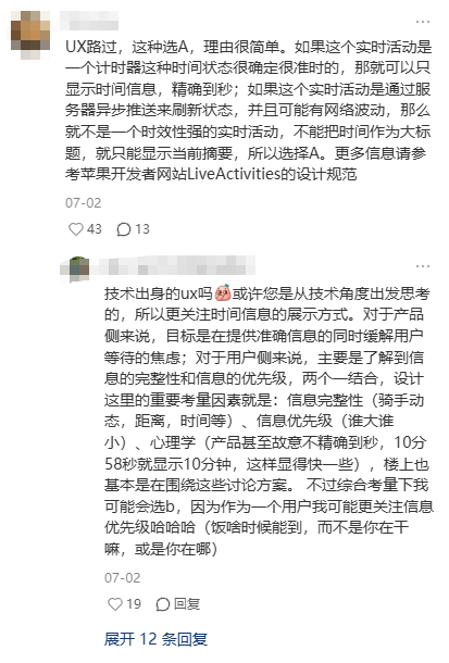 估计是讨论的人多了,为了明确限制场景,博主还在评论区补充了说明,“该界面出现在手机锁屏界面,呈小组件方式展示”。更加精准地描述了需求背景,也给大家的思考和讨论多了一些思考。