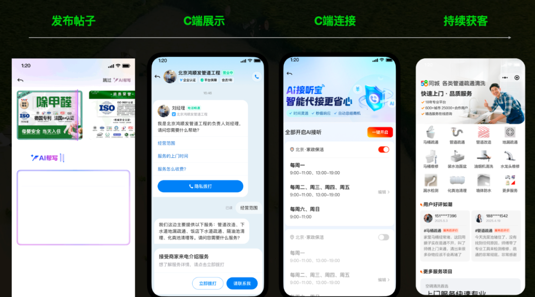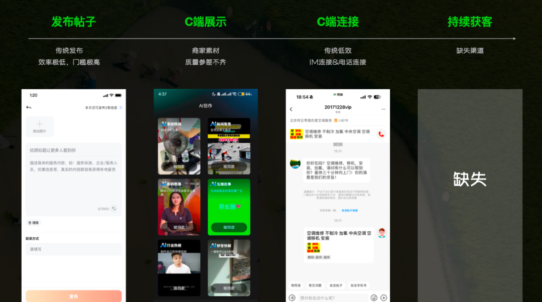 过去,商家的经营链路是断裂的,充满了效率的“断点”和机会的“漏点”。 故事往往是这样的:商家首先要耗费大量精力,艰难地完成内容发布,这一高门槛直接导致了后续的C端展示效果差强人意,难以吸引客户;即便有客户前来咨询,低效的连接方式又常常因为商家无法及时响应而错失商机;更关键的是,这条链路的终点是封闭的——商家几乎没有任何工具去持续获客,只能被动等待。这是一个环环相扣、消耗巨大却收效甚微的困境。