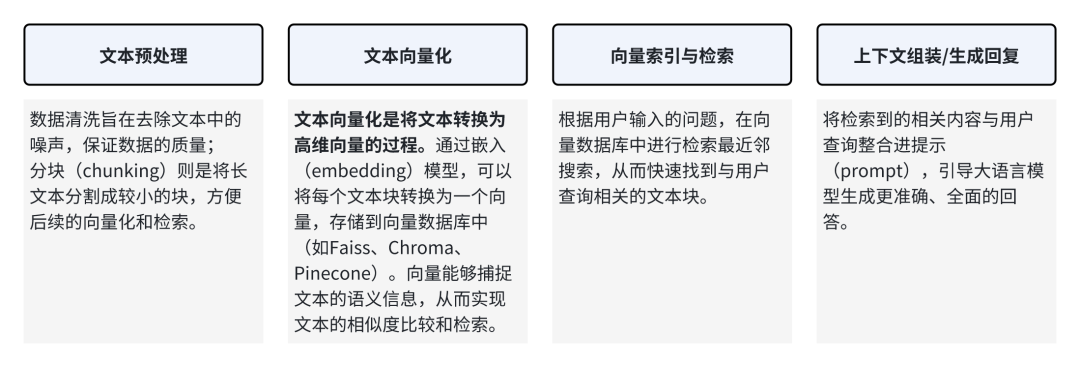 • 第一个大步骤就是将文本数据处理并进行向量化转化处理。这一步一般会用到 embedding 模型将文本块转化为向量并存储到向量数据库。