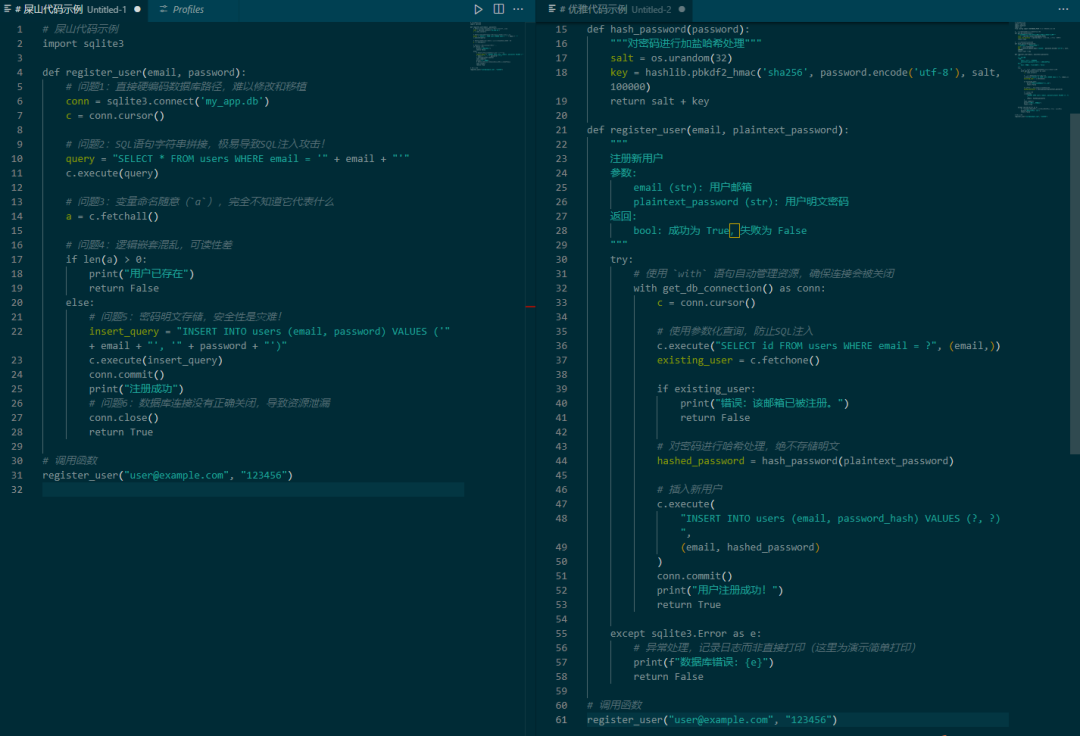 带着这个问题,我让deepseek给生成一个简单的需求:用户输入邮箱和密码,系统检查邮箱是否已被注册,如果未被注册,则将用户信息存入数据库。然后让deepseek分别生成了“屎山”代码和“非屎山”代码。这个是他的回答