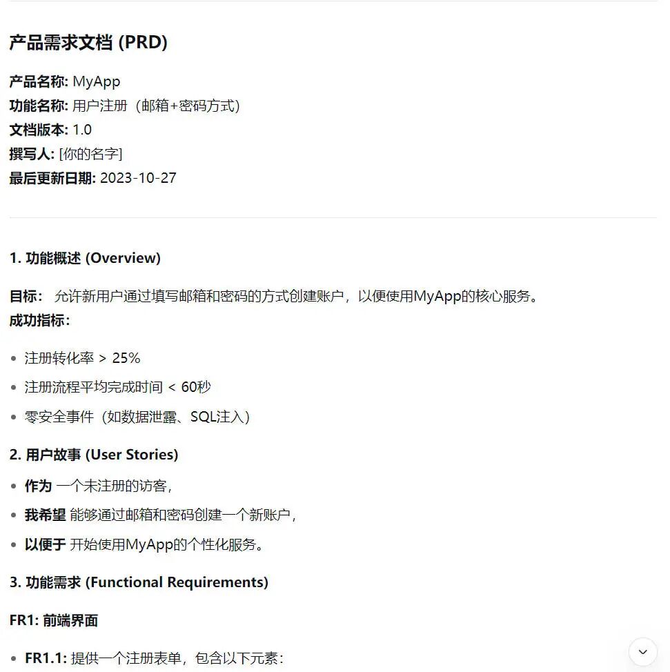 接下来我让AI生成一份符合清晰需求定义的PRD,他的回答如下: