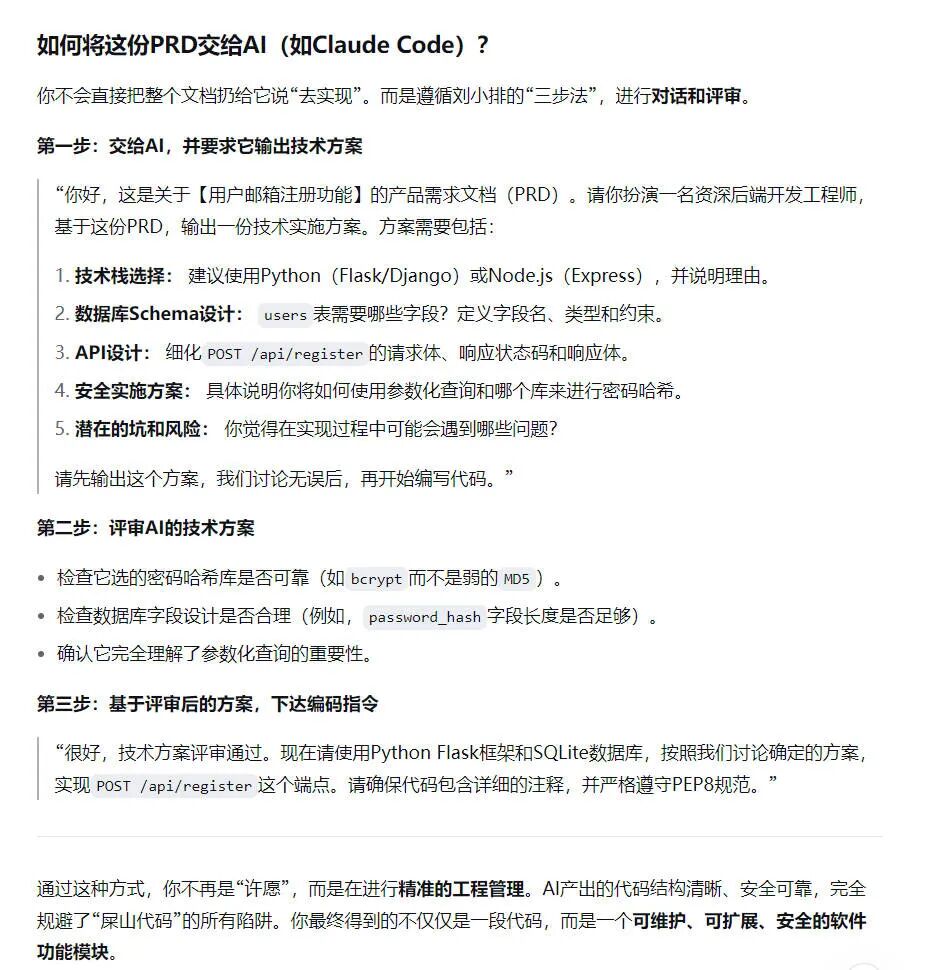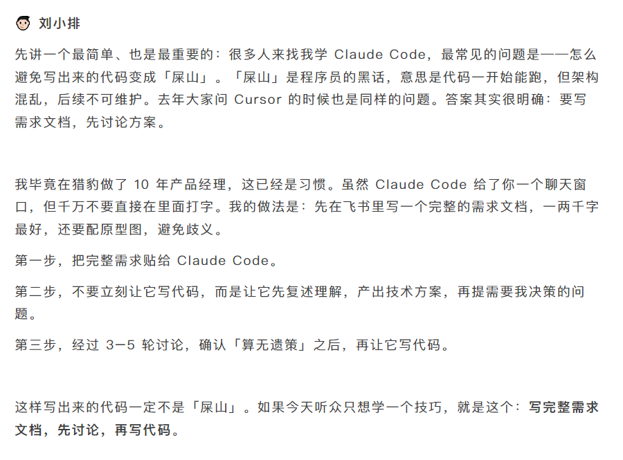 刘小排的核心思想可以概括为一句话:“像管理一个顶尖程序员一样去管理AI,而不是把它当成一个许愿机”。先写文档再讨论最后编码之所以有效,是因为它将“产品定义”和“技术实现”这两个阶段严格分开了,模拟了专业软件公司的开发流程。