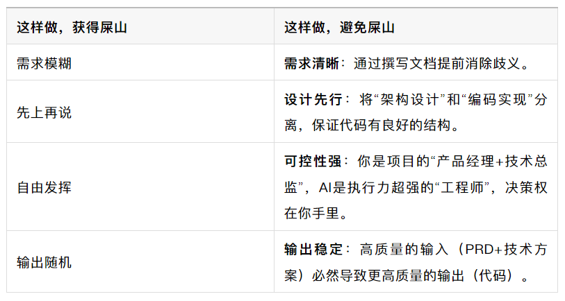 同时,详细的文档为AI提供了无比清晰的上下文,它不再需要“猜”你想要什么,最终文档本身就是后续验收AI产出方案的基准。