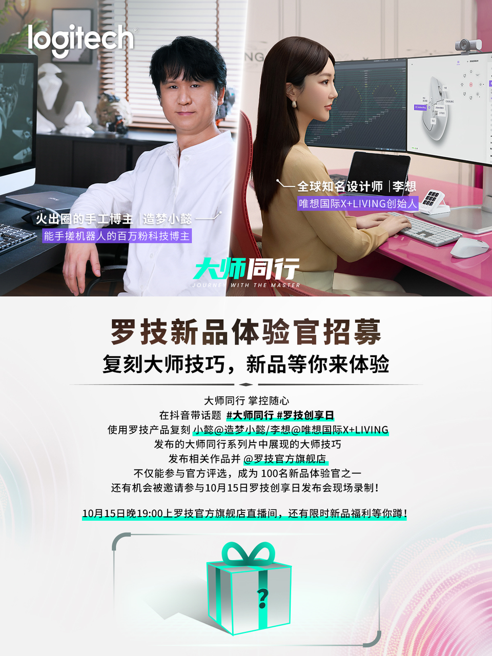 如果你也渴望拥有这样的“大师神器”, 欢迎来抖音话题下,看看@造梦小懿等大神是如何玩转设备的,并带话题#大师同行 #罗技创享日,并@罗技官方旗舰店,参与#罗技新品体验官招募 话题活动,挑战复刻大师同行系列片中同款操作,或者分享自己的罗技产品设置和灵感,不仅能参与官方评选,成为100名罗技新品体验官之一,还有机会被邀请参与10月15日罗技创享日发布会现场录制!