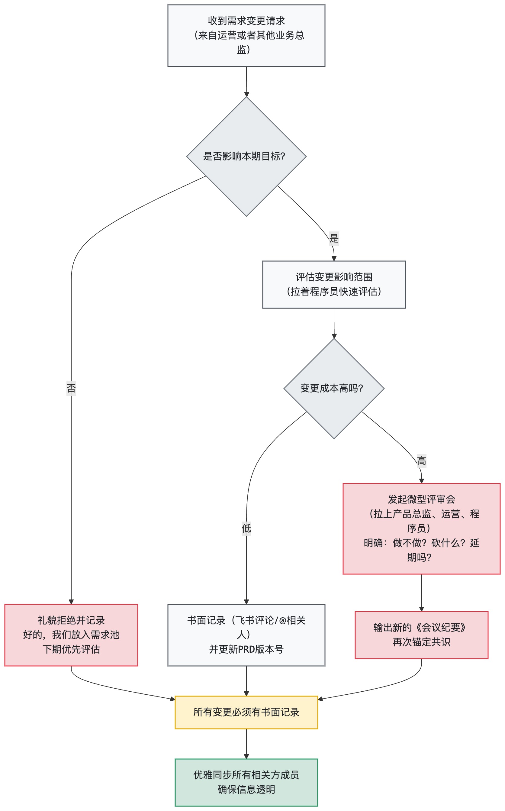 标准话术:“这个功能很有价值,为了不遗漏细节,请您在飞书需求池的《变更申请》模板里简单描述一下背景和目标,我们立即启动评估流程。”
