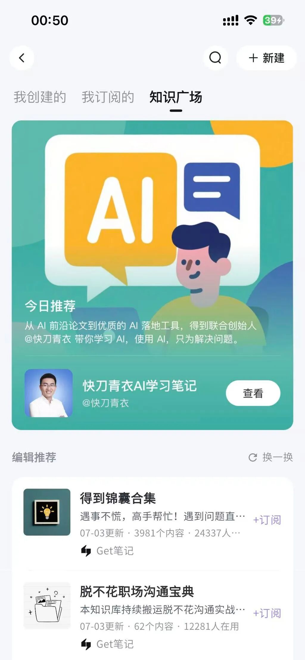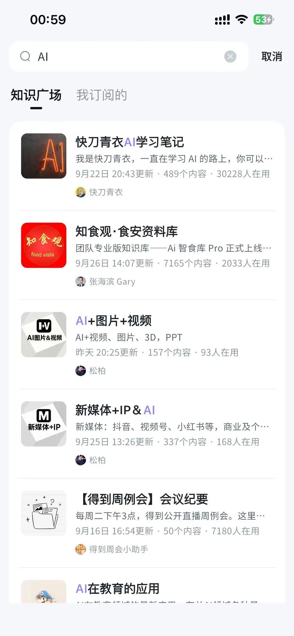 在移动端还有一个知识广场(PC端没有),展示其他人创建的公开知识库,从前端技术、AI学习、育儿笔记到运营应有尽有。