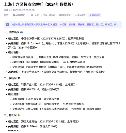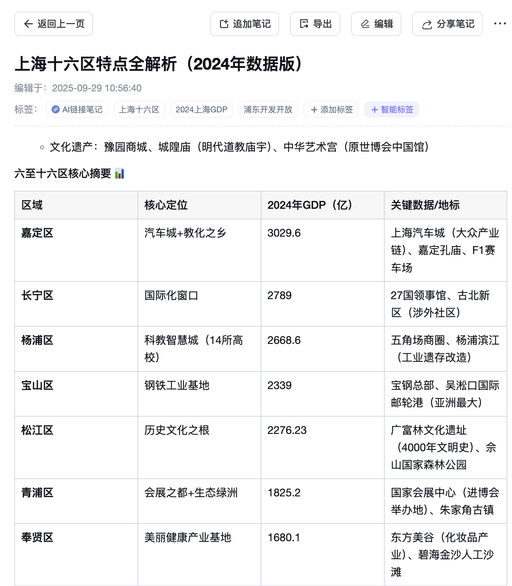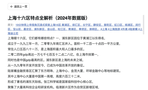 我发给它一个介绍上海各区的抖音视频,不仅生成了每个区的核心地位、关键数据、核心地标和战略定位,还在最后附上了对比的表格,内容完整准确。另外,也可以查看转录后的文本和源链接。