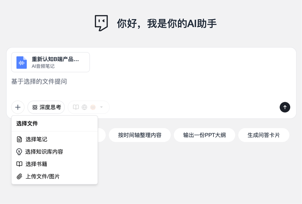 - 选择文件模式:可选择笔记、知识库、书籍和上传文件/图片,选择了文件后则会关闭内容范围模式,不选择则是默认为内容范围模式。