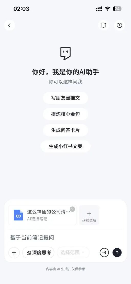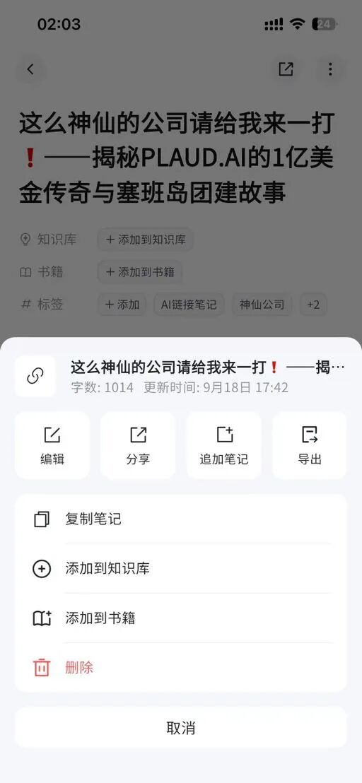 可以唤起AI助手基于当前笔记进行提问,也可以编辑、追加笔记、复制、添加到知识库、导出和分享。