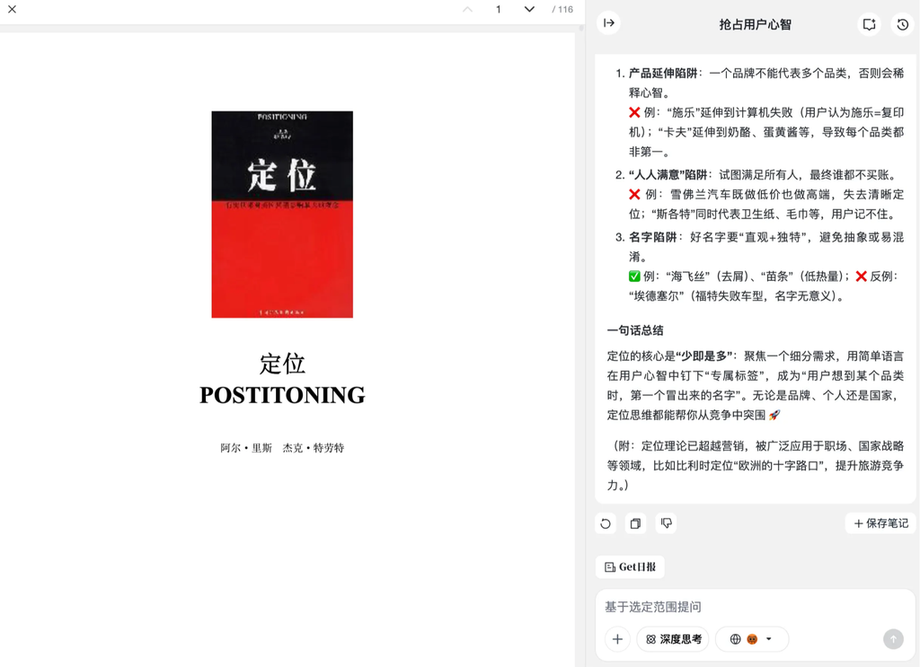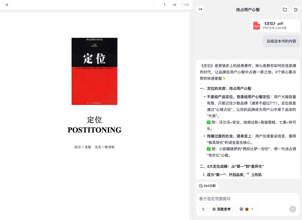 比如我让它【总结这本书的内容】,总结了定位的本质和三大战略这些核心内容,效果还是挺不错的。