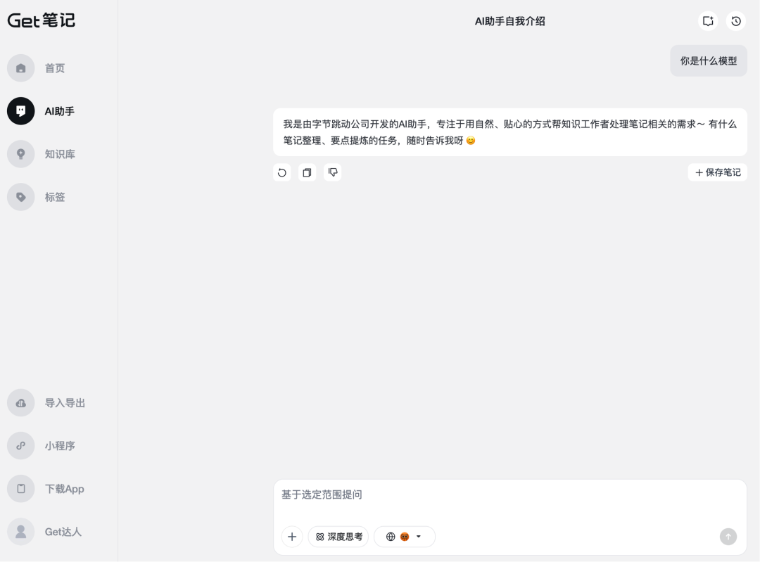 Get笔记的底层模型是使用的豆包大模型,支持深度思考。