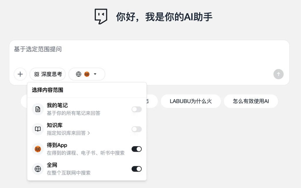 - 内容范围模式:可以基于我的所有笔记、指定知识库、得到APP和联网回答,用户的设置会保存下来。