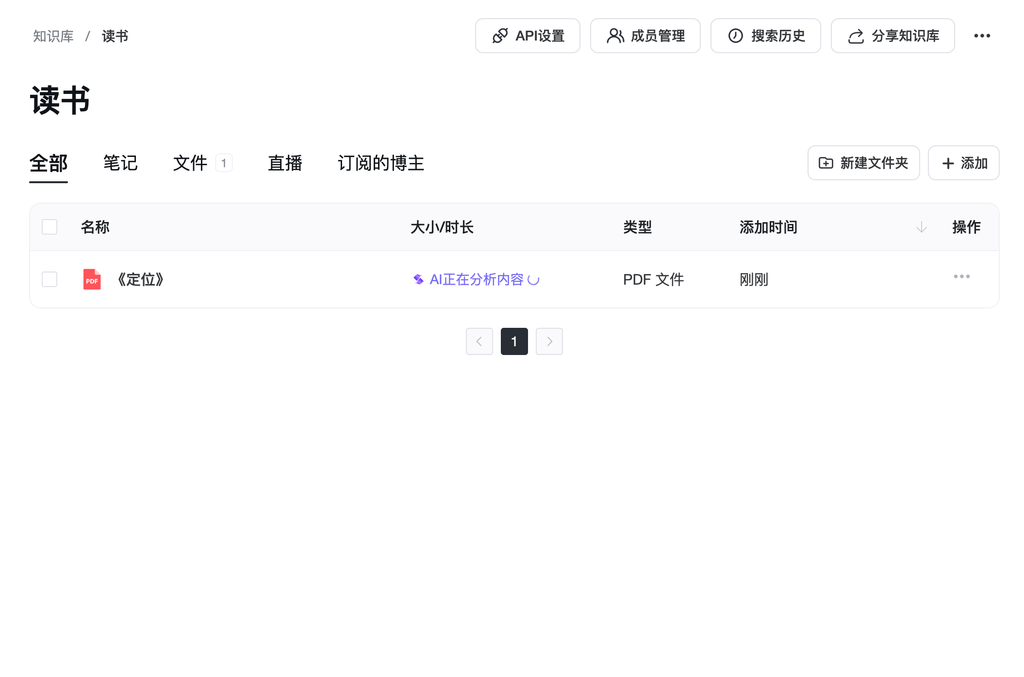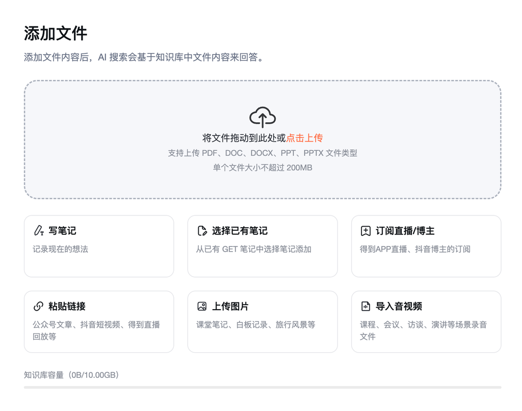 类型:在知识库中可添加笔记、文件、直播和订阅博主(支持抖音和得到,视频号和公众号已下线)。