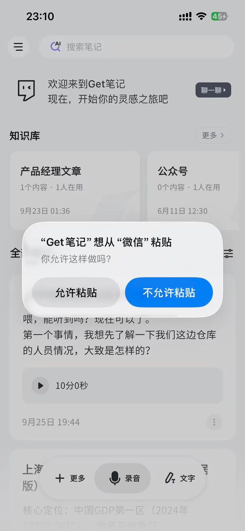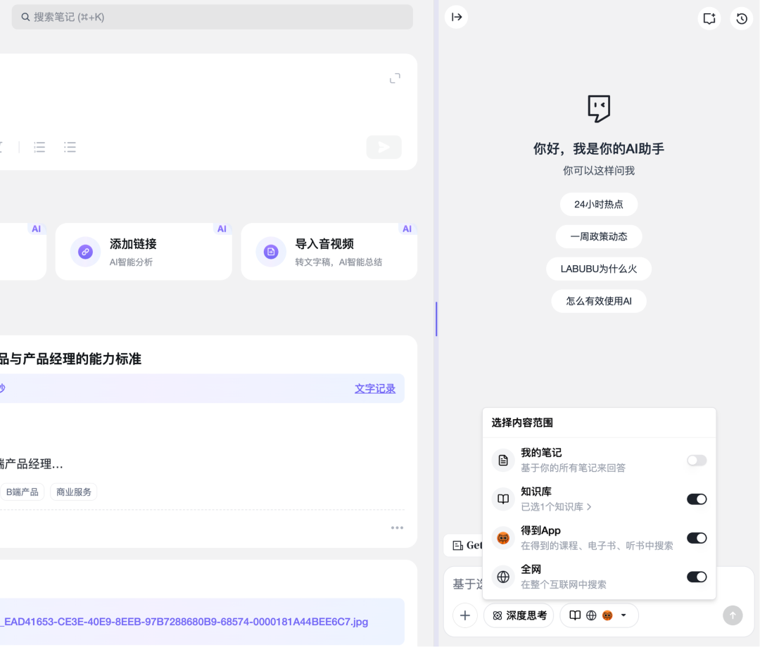 相对于模型产品,Get笔记的AI助手除了可以联网搜索和深度思考,还可以基于你的笔记、知识库和得到App问答,提高回答的准确率。