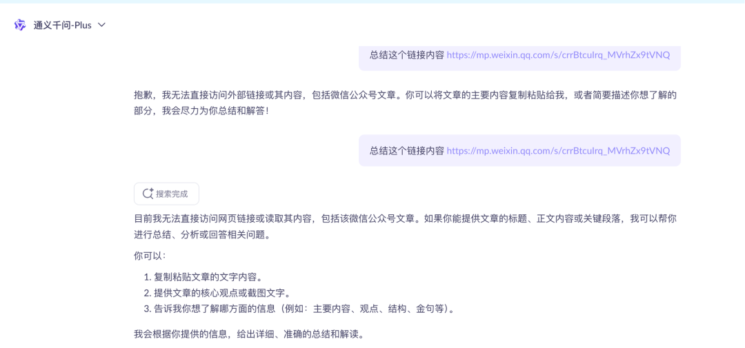- 图文链接:公众号文章、公开网站链接和小红书图文,除了文字还能理解图片内容。