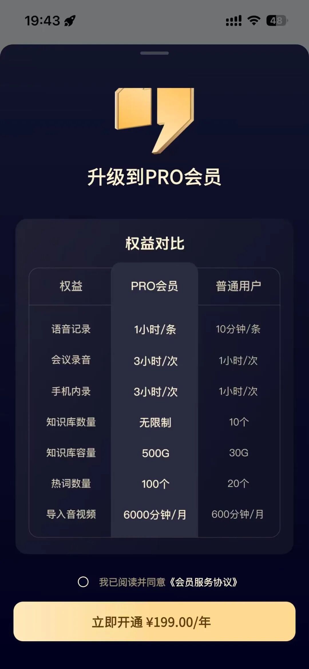 通过会员模式收费,199元/年,会员在录音时长和容量上有更高的额度,如下图。