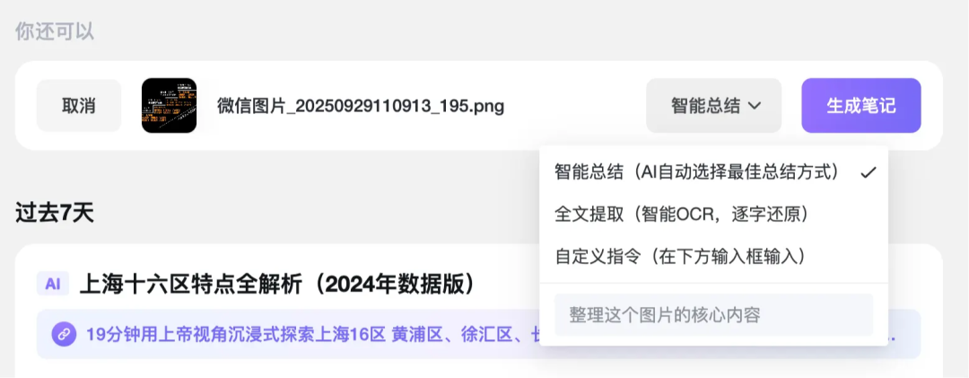 图片笔记支持三种模式:智能总结、全文提取(逐字还原)和自定义指令。