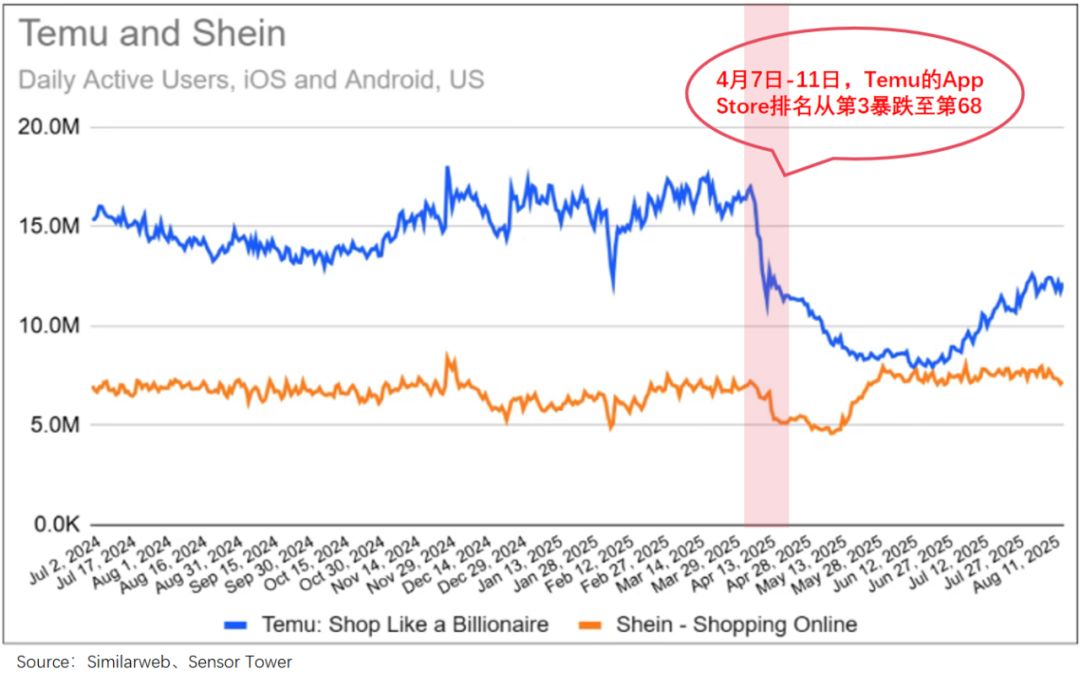 但今年4月,Temu停止在美区使用Google Shopping广告后,其App Store排名、月活用户数断崖式下滑,自然流量转化率更是骤降近90%。