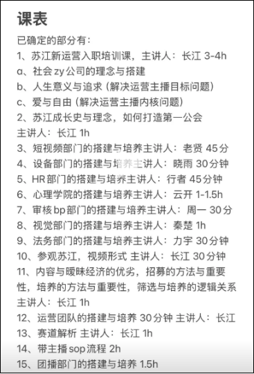 据目前公布的培训课表显示,此次培训内容包括“苏江新运营入职培训课”、“短视频部门的搭建与培养”、“带主播SOP流程”、“团播部门的搭建与培养”、“HR部门的搭建与培养”等内容,核心为公会搭建和团队搭建。