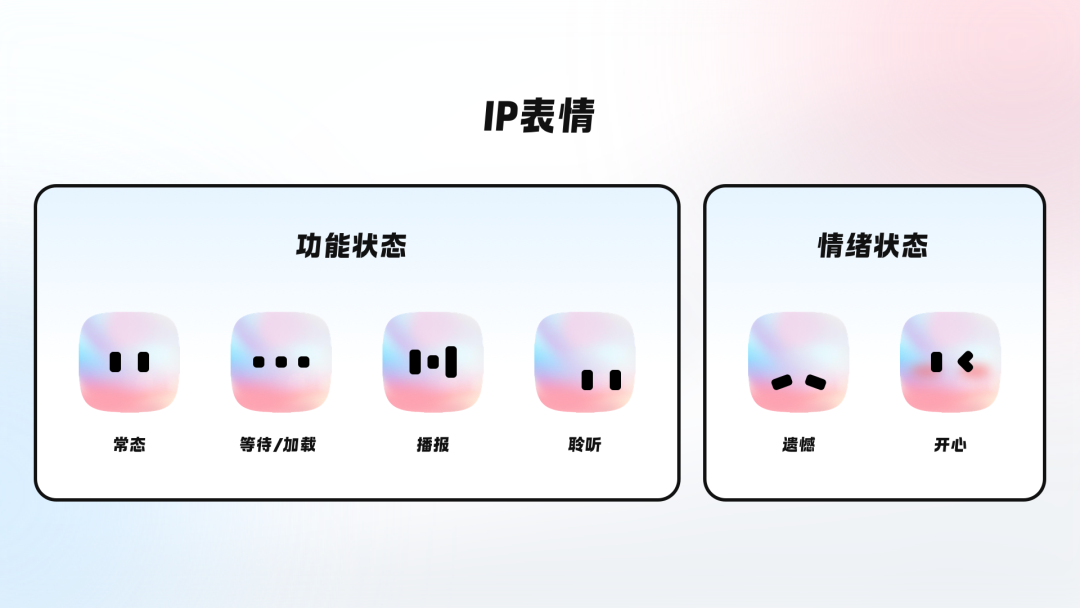 - 功能状态:多用于聊天对话过程的表情交互。如“常态”时上下轻微浮动并眨眼,“聆听”时身体倾斜并看向输入框、“播报”时微笑示意,让对话充满生命力。