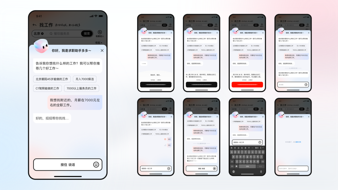 这款智能求职助手,是我们将技术能力转化为蓝领用户幸福感的一次实践。对蓝领用户而言,“对话”代替“筛选” 大幅降低了使用门槛——无需反复点击、打字或理解复杂分类,只需像聊天一样表达需求,就能快速匹配岗位。