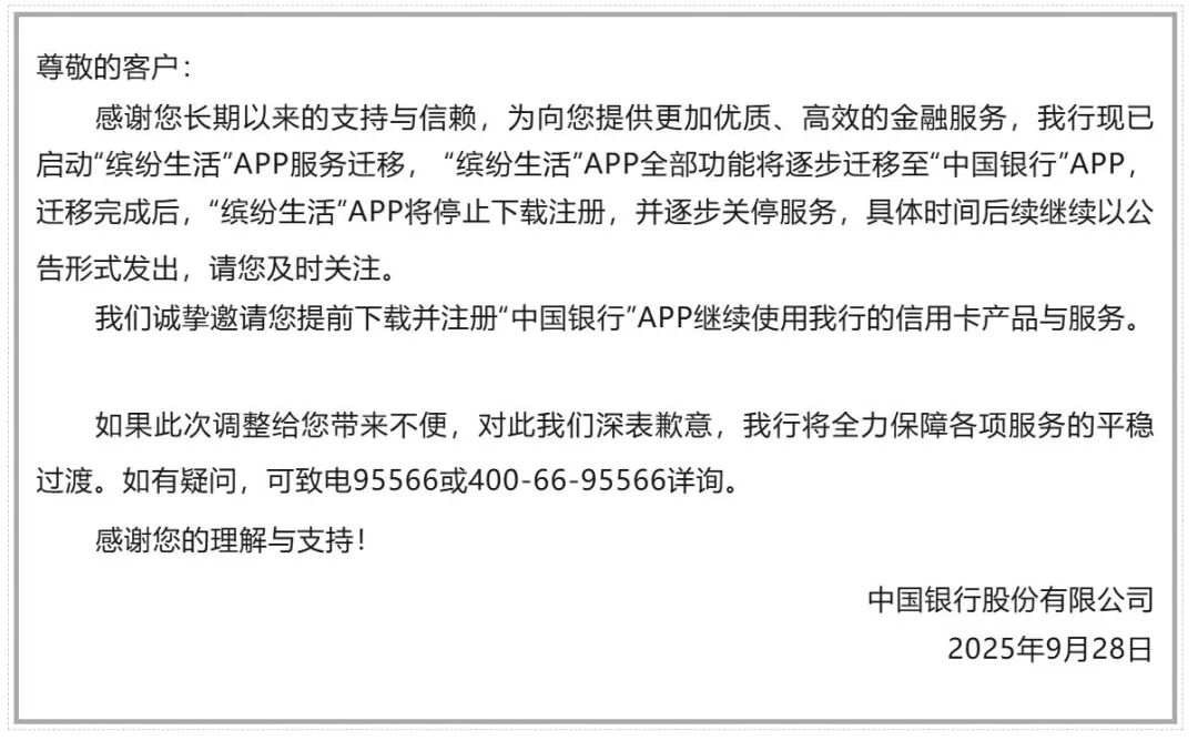 近日,中国银行发布公告称,该行旗下信用卡App“缤纷生活”将停止下载注册,并开启服务迁移,“缤纷生活”App全部功能将逐步迁移至“中国银行”App。