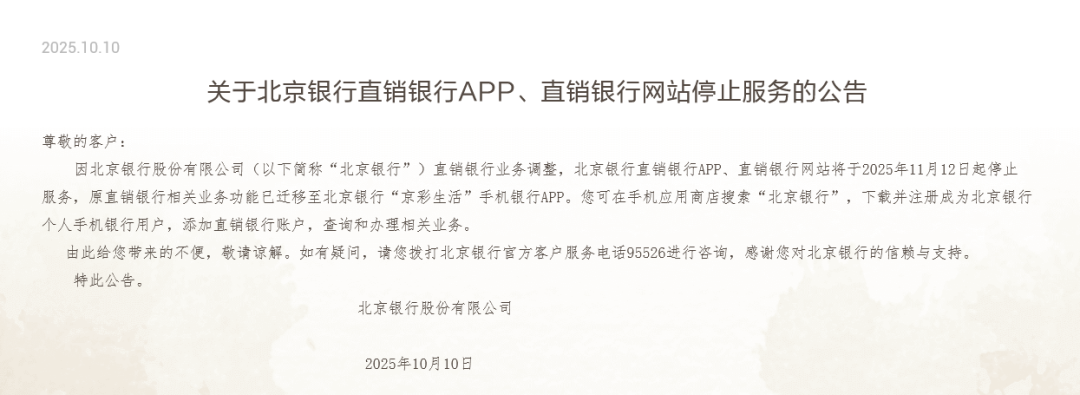 此外,北京银行发文称旗下直销银行APP、网站将于2025年11月12日起停止服务,相关业务已迁移至“京彩生活”手机银行APP。