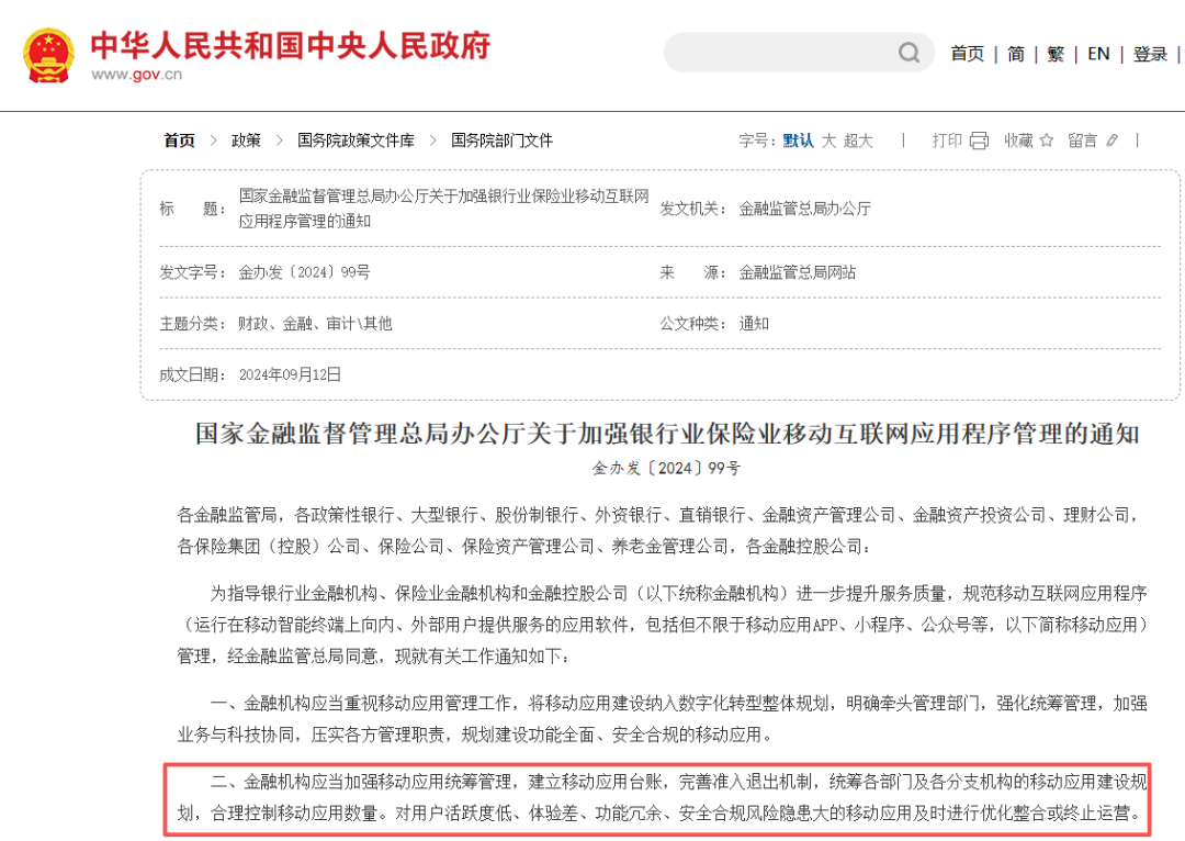 国家金融监督管理总局在2024年9月发布的《关于加强银行业保险业移动互联网应用程序管理的通知》中提出,金融机构需要对其运营的移动互联网应用程序进行定期的评估和优化。对于那些用户活跃度低、用户体验差、功能冗余,或者存在较大安全合规风险隐患的移动应用,应当及时进行优化整合或者终止运营。