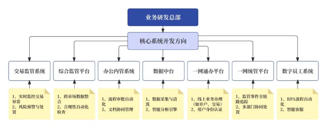 负责业务支撑、交易监管、综合监管、办公内管等业务系统和数据中台的整体技术规划、需求分析与设计、技术研发、交付和二线支持;