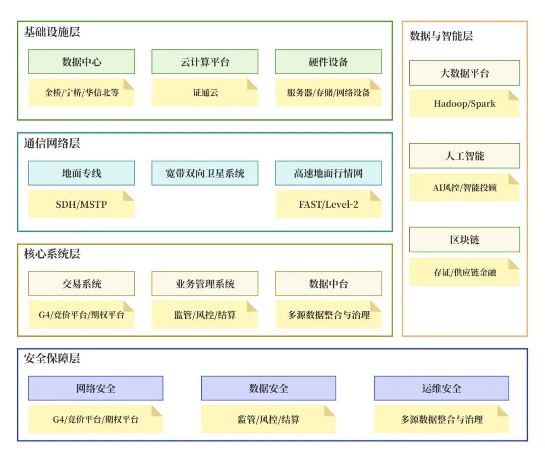 了解了上交所技术的组织架构后,现在我们再来了解:上交所技术的技术架构,看看上交所技术的架构演进过程、再去理解它,可能会我们大家带来不同启示和洞察。先从上交所技术架构全景图开始,它包括五大模块:基础设施层、通信网络层、核心系统层、数据与智能层、安全保障层,如下图所示。