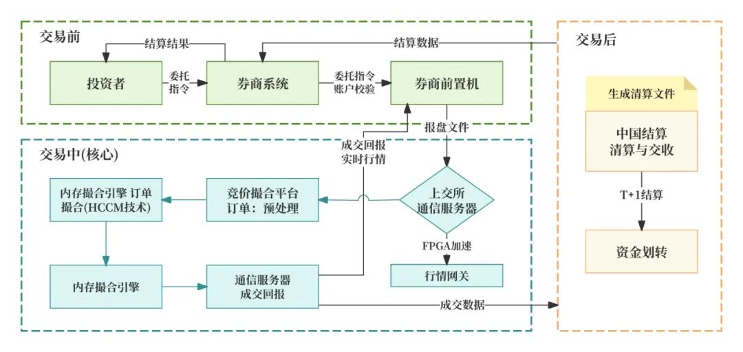 特附上文字版交易全流程:投资者 -> 券商系统:下单(限价/市价) ;券商系统 -> 上交所通信服务器:报单(含环境号) 通信服务器 -> 竞价撮合平台:订单预处理;竞价撮合平台 -> 内存撮合引擎:订单撮合(HCCM技术);内存撮合引擎 -> 通信服务器:成交回报;通信服务器 -> 券商系统:返回成交结果;券商系统 -> 登记结算系统:生成清算文件。交收完成后,券商系统会收到最终确认,并据此在投资者的账户中完成股份和资金的正式变更。