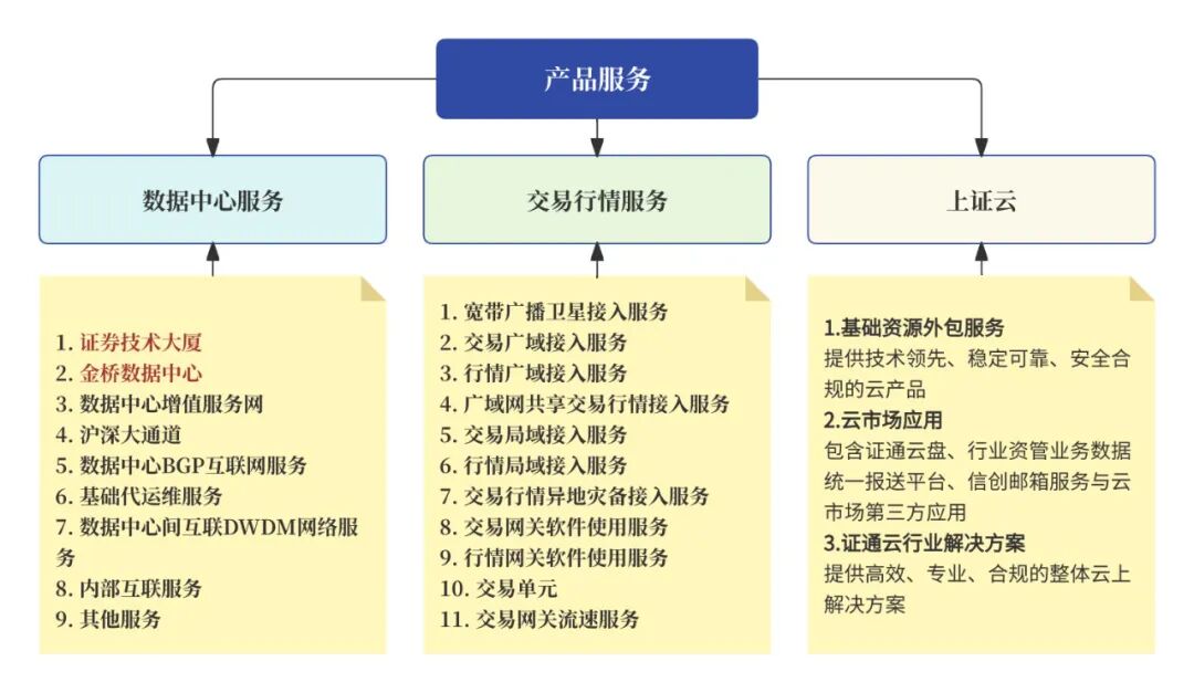 为了维护证券市场的平稳发展,交易报盘安全、可靠的运行,面向各类金融机构客户提供一系列安全、成熟、高效的数据中心服务、交易行情服务、上证云等配套服务,如下图所示: