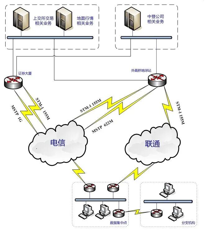 上交所技术为满足金融市场用户高带宽、高性能及多业务数据传输的集中交易需求,基于电信运营商SDH网络架构,为地面宽带通信系统用户数据集中点与分支机构提供的集中交易及行情信息传送服务。