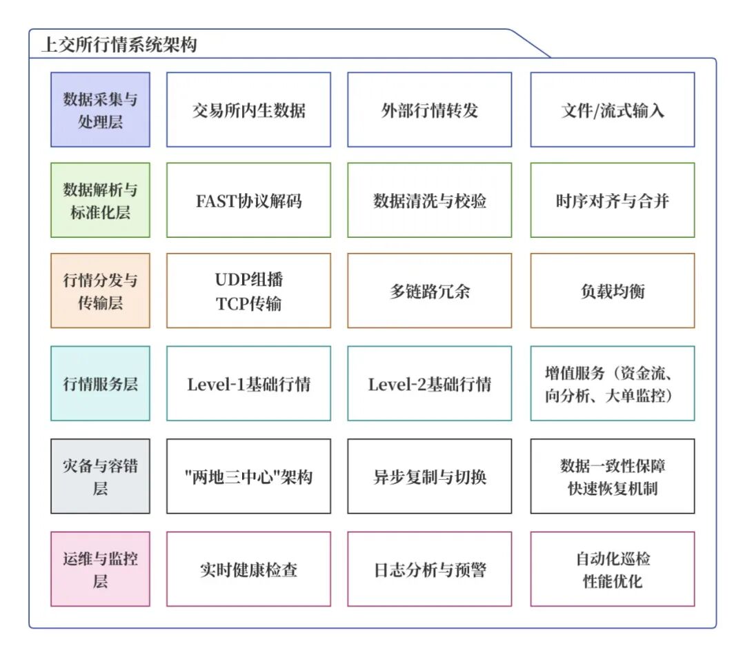 上交所的行情系统通过分布式架构设计、协议优化、多级缓存机制及智能流量调度等核心技术实现高并发处理能力,其核心架构与策略可归纳为以下六大维度,如下图所示: